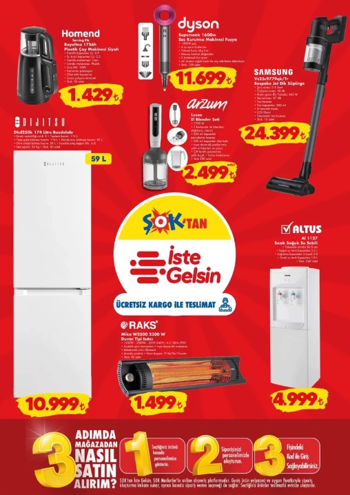 ŞOK Marketler, “İste Gelsin” kataloğuyla ev ekonomisine can suyu veriyor. Dyson saç kurutma makinesinden Samsung dikey süpürgeye, modern mobilya takımlarından beyaz eşyaya kadar onlarca ürün, ücretsiz kargo avantajıyla satışa çıktı. İşte haftanın en çok konuşulacak indirimli ürünler listesi!