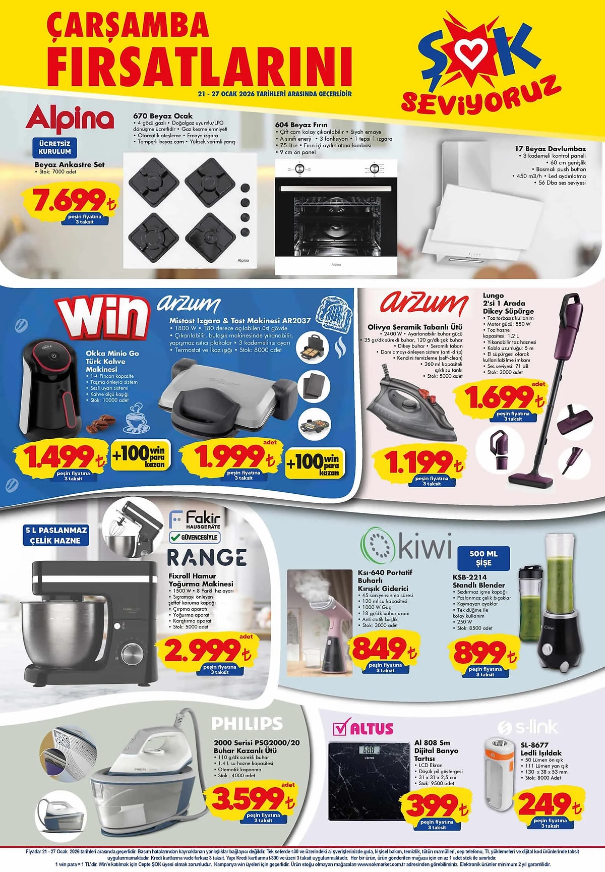 Her hafta sunduğu kampanyalarla alışverişçilerin radarına giren ŞOK, ocak ayının son haftasına iddialı bir katalogla giriyor. 21 Ocak Çarşamba gününden itibaren geçerli olacak aktüel ürünler listesinde özellikle hamur yoğurma makinesi, küçük ev aletleri ve mutfak ürünleri ön plana çıkıyor. Sınırlı stokla satışa sunulacak ürünler, hafta boyunca raflarda olacak.